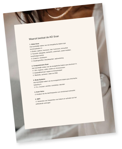 * Disclaimer: de ao scan geeft een energetische diagnose, geen medische diagnose. de ao scan kan gebruikt worden als energetisch hulpmiddel en kan gebruikt worden als aanvulling op medische behandelingen.